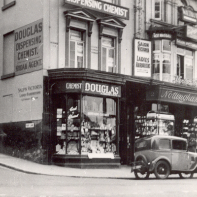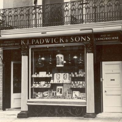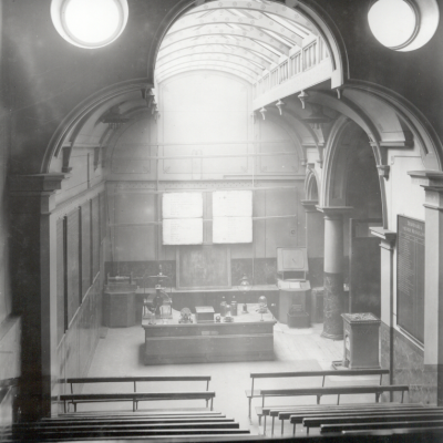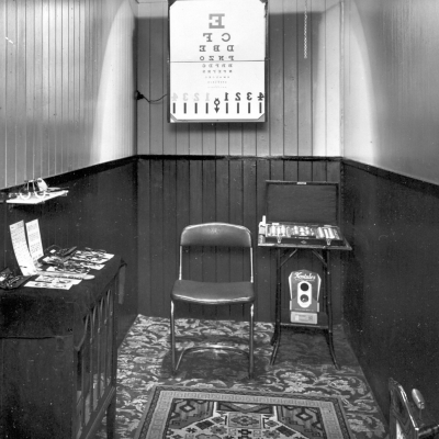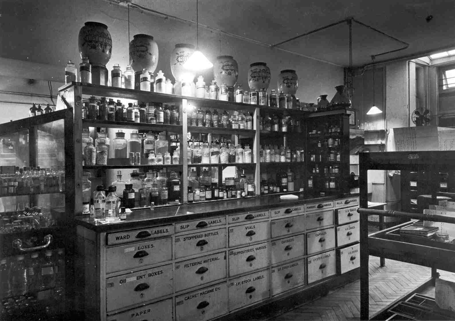 Black and white photograph of part of the old pharmacy department at St. George’s Hospital, London. In this photograph draws and shelves can be seen storing bottles of medicine, shop rounds and equipment.