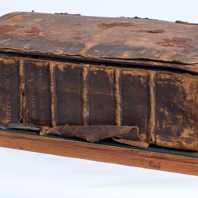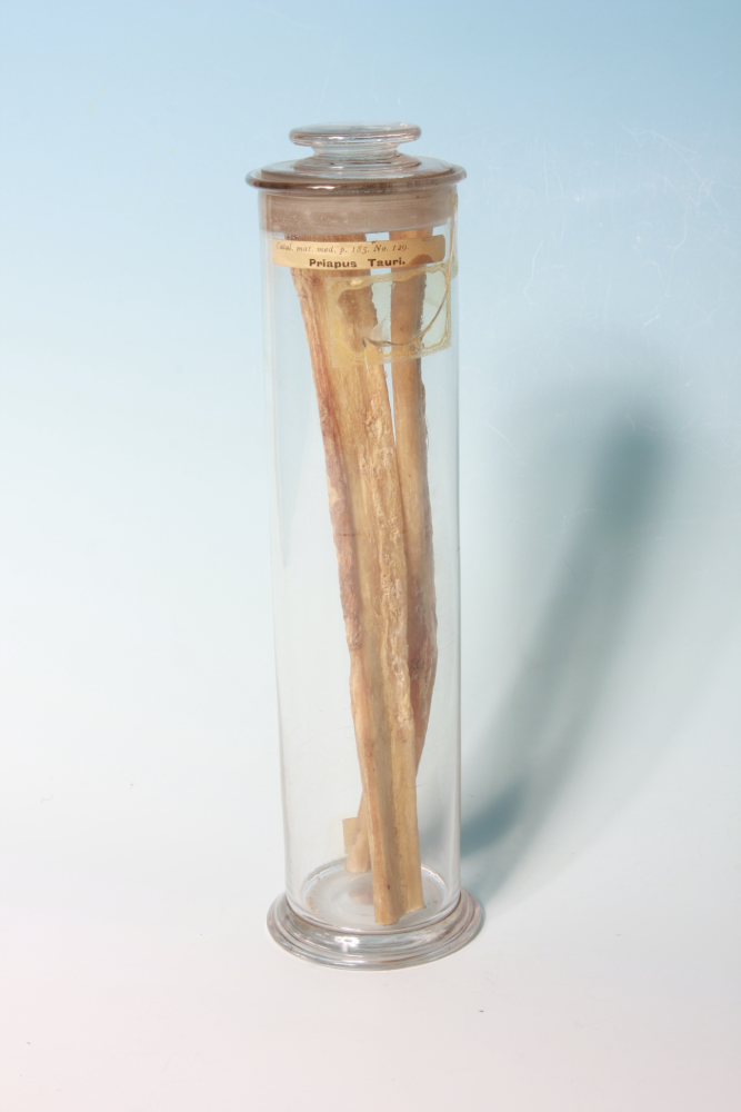 Glass specie jar containing two specimens of bull’s penile bone. From the Burges Collection.