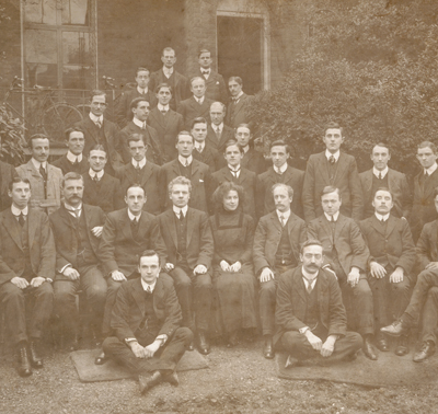 Black and white portrait of Professor Theophilus Redwood sitting on a chair and leaning on the table. Redwood was registered with the Pharmaceutical Society of Great Britain from its founding in 1841. He was Professor School of Pharmacy 1842-1846, Professor Chemistry and Pharmacy 1846-1885 and Director of Laboratory 1844-1862.