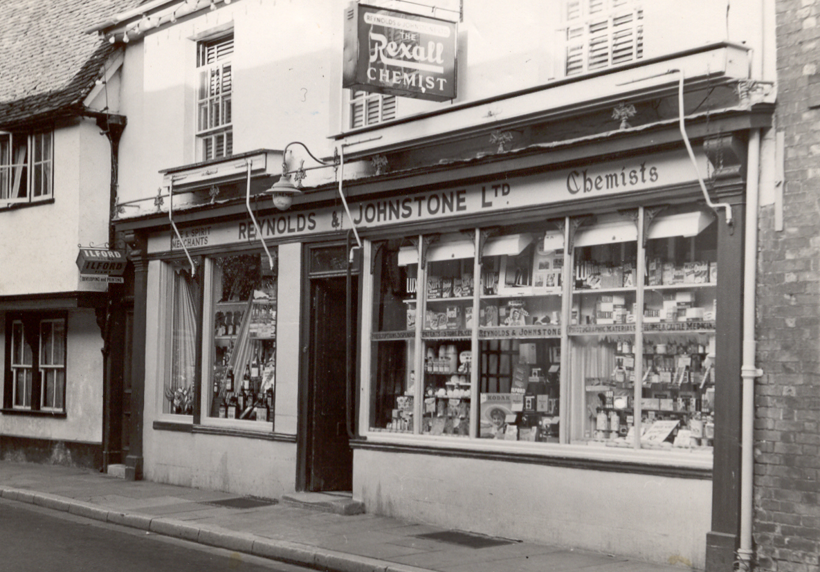 Black and white photograph of Reynolds and Johnstone Ltd., Chemists, Wine and Spirit Merchants, 17 St Mary’s Street, Wallingford-on-Thames, Berkshire, England. Oblique view of frontage and shop window, showing display.