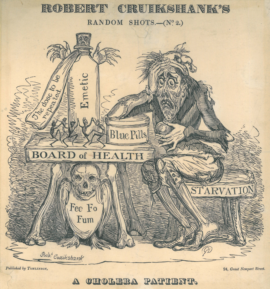 Mounted woodcut entitled ‘ROBERT CRUIKSHANKS RANDOM SHOTS. – (NO.2) A CHOLERA PATIENT.’ drawn by Isaac Robert Cruikshank, engraved by “G W”, and published by Tomlinson.