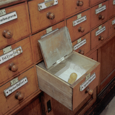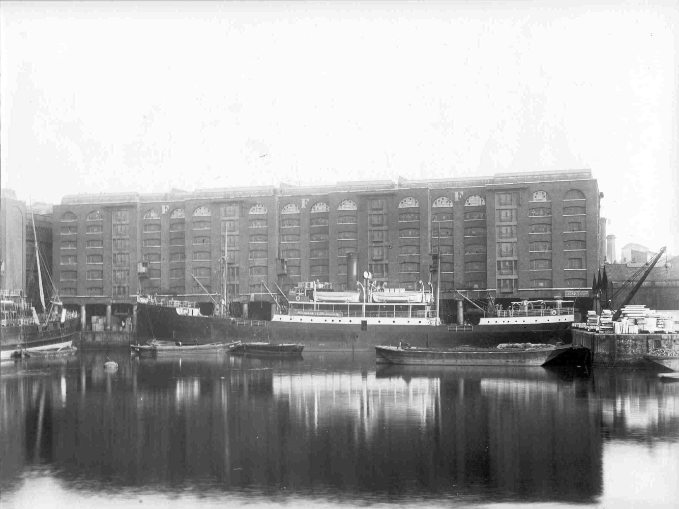 Black and white photograph of the exterior of the rubber warehouse and facilities of the Argos Steamship Company, London and Bremen Line, St Katharine Docks. A freighter can be seen moored in front of the warehouse. The expansion of large-scale trade in pharmaceutical raw materials during the nineteenth century was not only confined to crude drugs of plant origin. Many materials had to be imported. Non-medicinal commodities used in the production of medical and pharmaceutical equipment and appliances were also important, as illustrated by the transportation and storage of rubber in the early twentieth century.