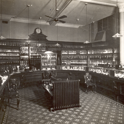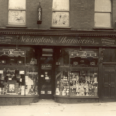 Black and white photograph showing exterior view of ‘S.N. White, M.P.S. Pharmacist’, Topsham, Devon. The photograph shows a view of the shop window displays and entrance looking into shop. Pharmacists often highlighted their membership of the Pharmaceutical Society (M.P.S.) on their shop fronts. Pharmacy ‘Established in 1823’. One of a series of images collected by the Society’s History of Pharmacy Committee in the 1950s to record the rapidly disappearing traditional pharmacy.