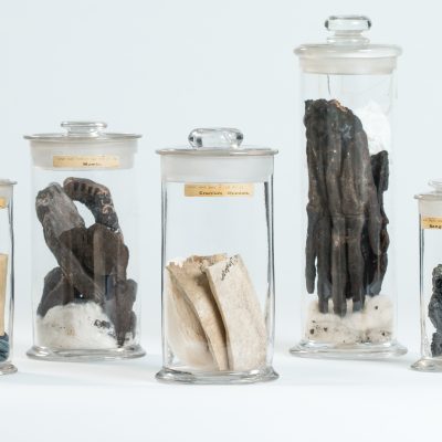 Text on paper labels reads ‘Catal. Mat. Med. p. 130, no. 105’ and ‘SANGUIS HIRCI’.