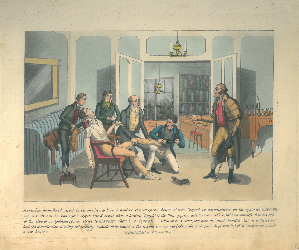 The inscription underneath tells the story: “Sauntering down Bond Street, in the evening, to “Lose and neglect the creeping hours of time”, espied an aquaintance on the opposite side of the way; was alive to the chance of a supper, darted across, when a heedless “Knight of the Whip”, passing with his crazy vehicle, laid me senseless; thus conveyed to the shop of an Apothecary, was stript to ascertain where I was injured, “When sorrows come, they come not single handed, but in battalions”, had the mortification of being sufficiently sensible to be aware of the exposure of my wardrobe, without the power to prev