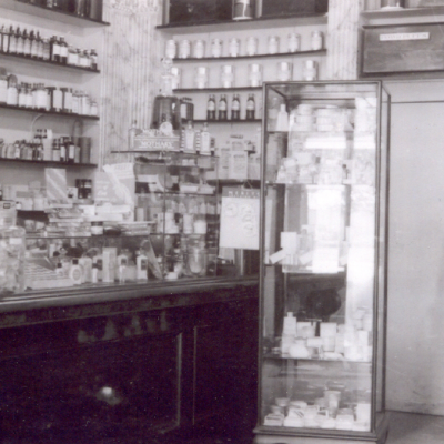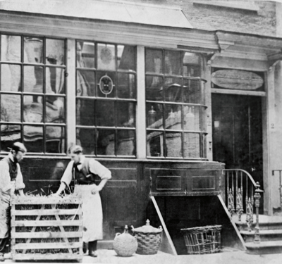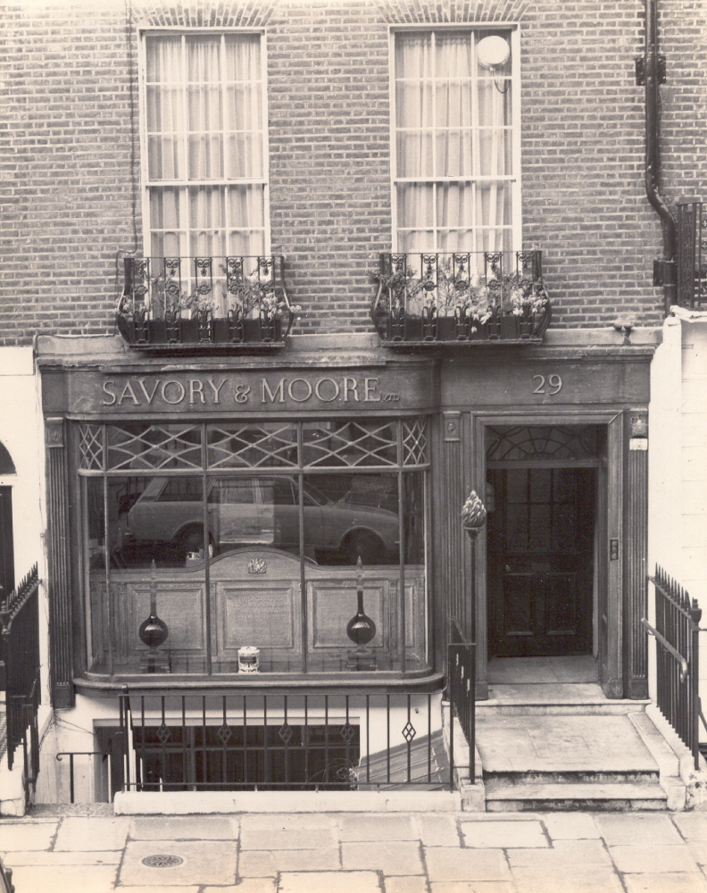 Black and white photographic print. Exterior view of Savory and Moore, Limited at 29 New Bond Street, London. Photograph shows carboys in shop window. The photograph was taken in the 1970s.