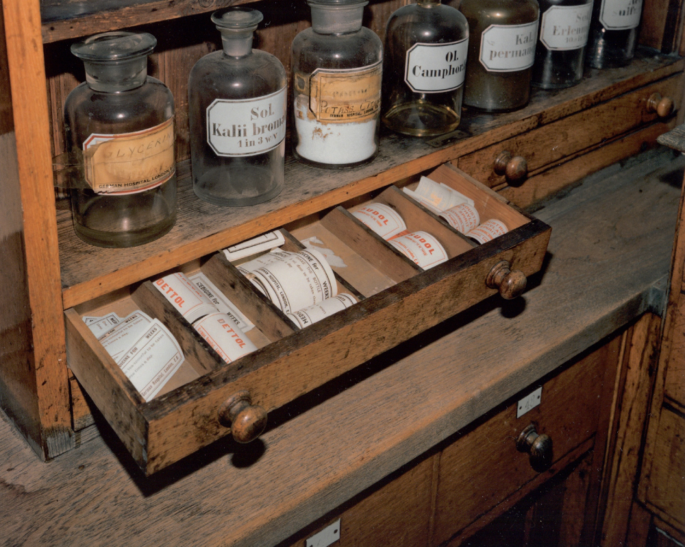 Colour photographic print. Close-up view of shop rounds and drawers in the German Hospital Pharmacy, Hackney, London. One drawer is open to show prescription labels.
