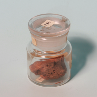 Glass jar containing specimens of burnt sponge (Euspongia officinalis). From the Burges Collection.