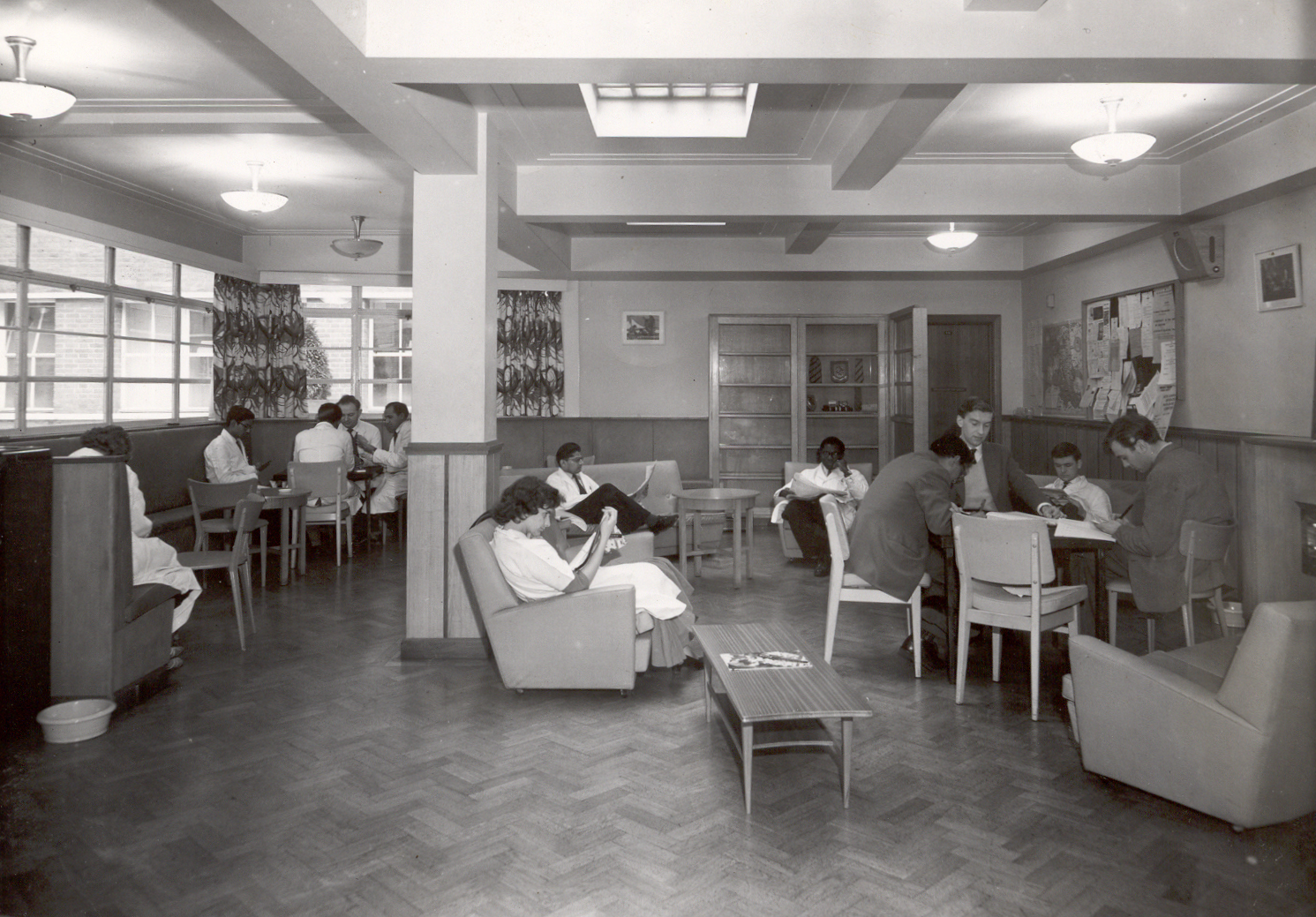 Black and white photograph of the students’ common room at the School of Pharmacy, University of London at Brunswick Square, London. People sitting around reading and talking.
