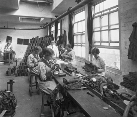 Black and white photograph of women inspecting masks with stacked canisters in background. Although primarily concerned with the wholesale and manufacturing side of pharmacy, the business of John Bell, Hills and Lucas, Ltd., Wholesale Druggists, Oxford Works, Tower Bridge Road, London, S.E. turned its efforts to producing anti-gas respirators during the First World War, for which they engaged a large female workforce.