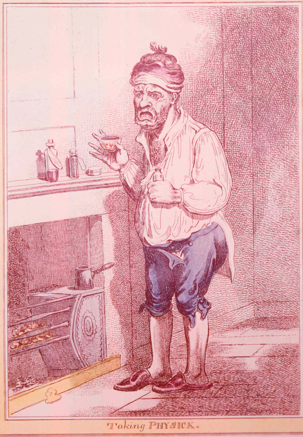 From the mid-1700s to mid-1800s, the effects of medication were an important subject of satire. This image is repeated in the work of a number of artists, expresses through the anguish and facial distortion of the patient the horrible taste of the medicine.