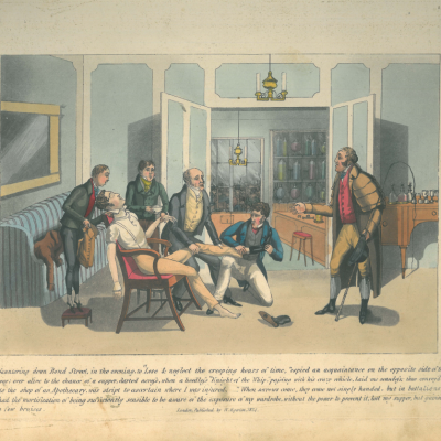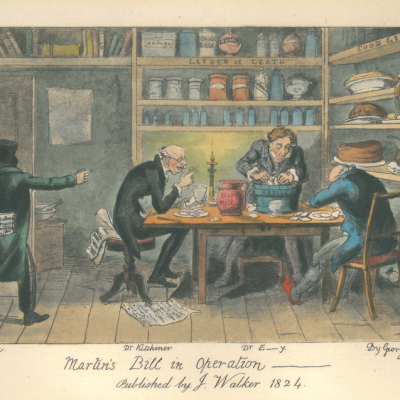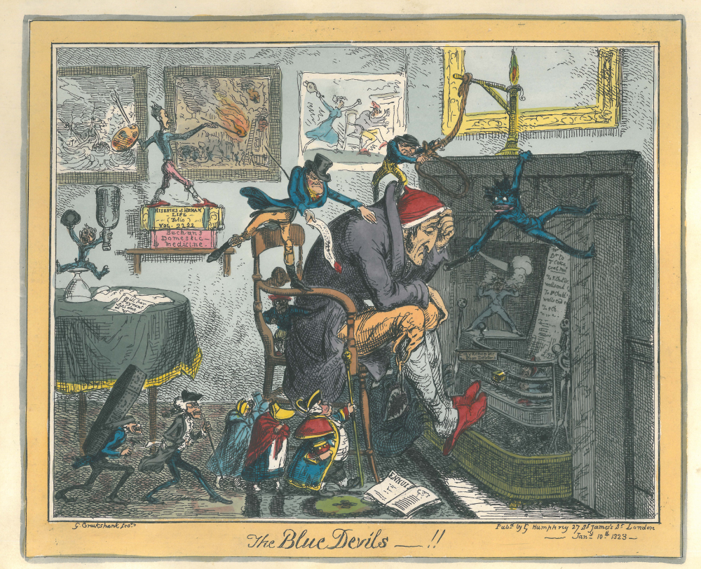Mounted hand coloured etching, entitled ‘The Blue Devils__!!’, drawn and etched by George Cruikshank and published by G. Humphrey in 1823.