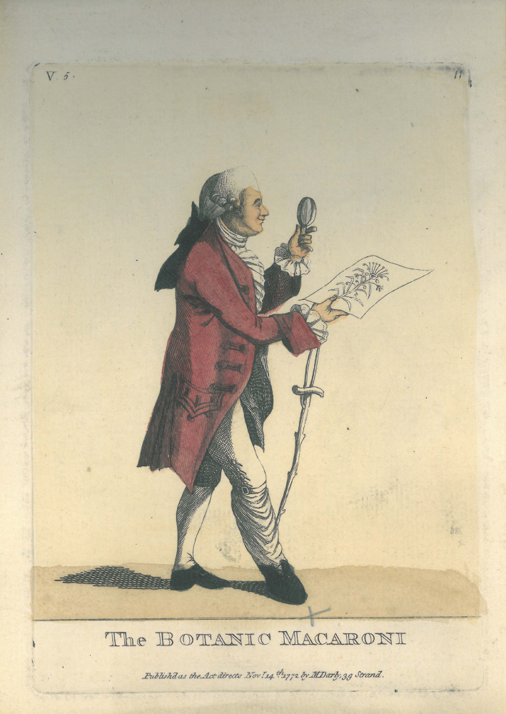 This is a satire on the English naturalist, botanist and explorer Sir Joseph Banks (1743-1820). A macaroni was a disparaging term used for a follower of exaggerated continental fashion in the mid to late 1700s.