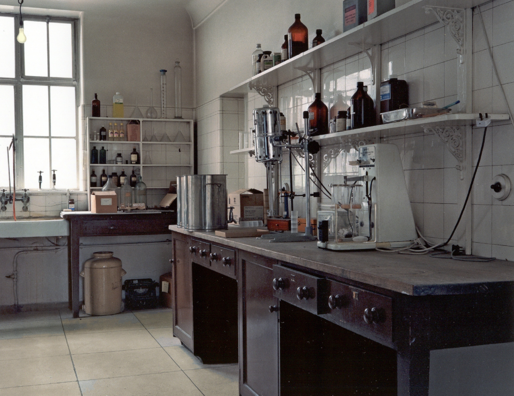 Colour photographic print. Interior view of a white tiled room in the German Hospital Pharmacy, Hackney, London with various bottles, laboratory equipment and sink.