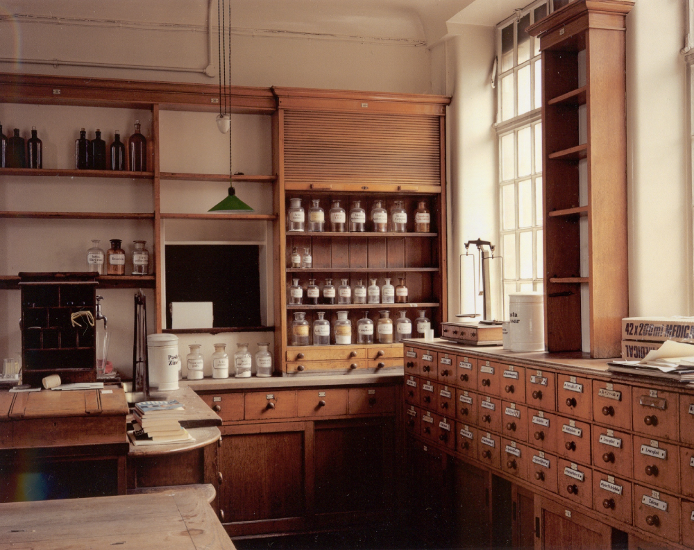 Colour photographic print. Interior view of the German Hospital Pharmacy, Hackney, London with shop rounds, drug run drawers and scales.