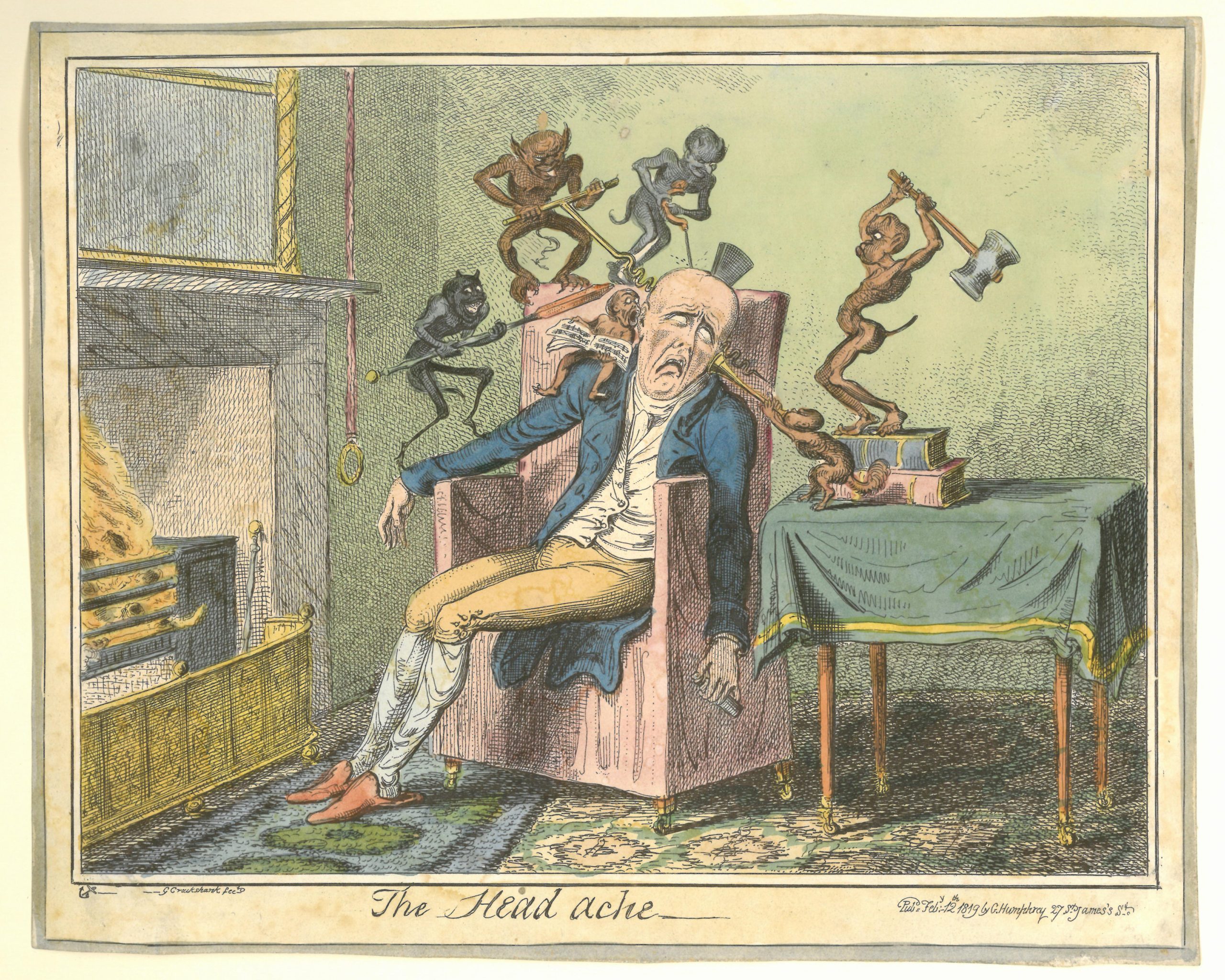 ‘The Headache’ shows a man slumped in an armchair by the fire, holding a medicine bottle. Grimacing in pain and despair, with upturned eyes, he is tormented by six little demons who attack his head with a red-hot poker, auger drill, bit, mallet and wedge. One demon sings loudly from a music-book in one ear, while another blows a trumpet in his other. Here the demons are personified metaphors for the pain that the patient is suffering from.