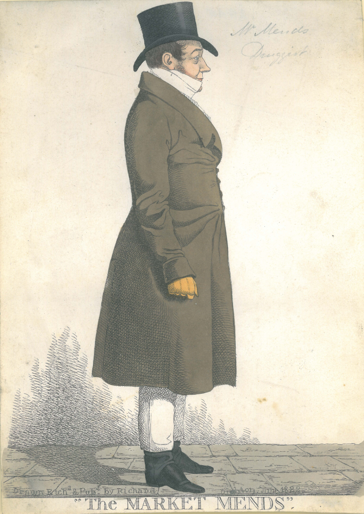 ‘The Market Mends’ consists of a full-length portrait in profile of a prosperous druggist, Mr. Mends wearing a top hat, and dressed in a long single-breasted brown coat over white trousers. A wall forms the background. ‘Mr Mends Druggist’ is written in pencil next to the portrait. The title ‘The Market Mends’ is not only a play on words regarding his name, but also refers to his affluence as a pharmacist.