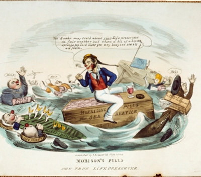 Mounted hand coloured etching, entitled ‘The Porter Brewer and his Family – or the Modern Druggist.’, drawn by Isaac Cruikshank, etched by anon, and published by Samuel William Fores in 1807.