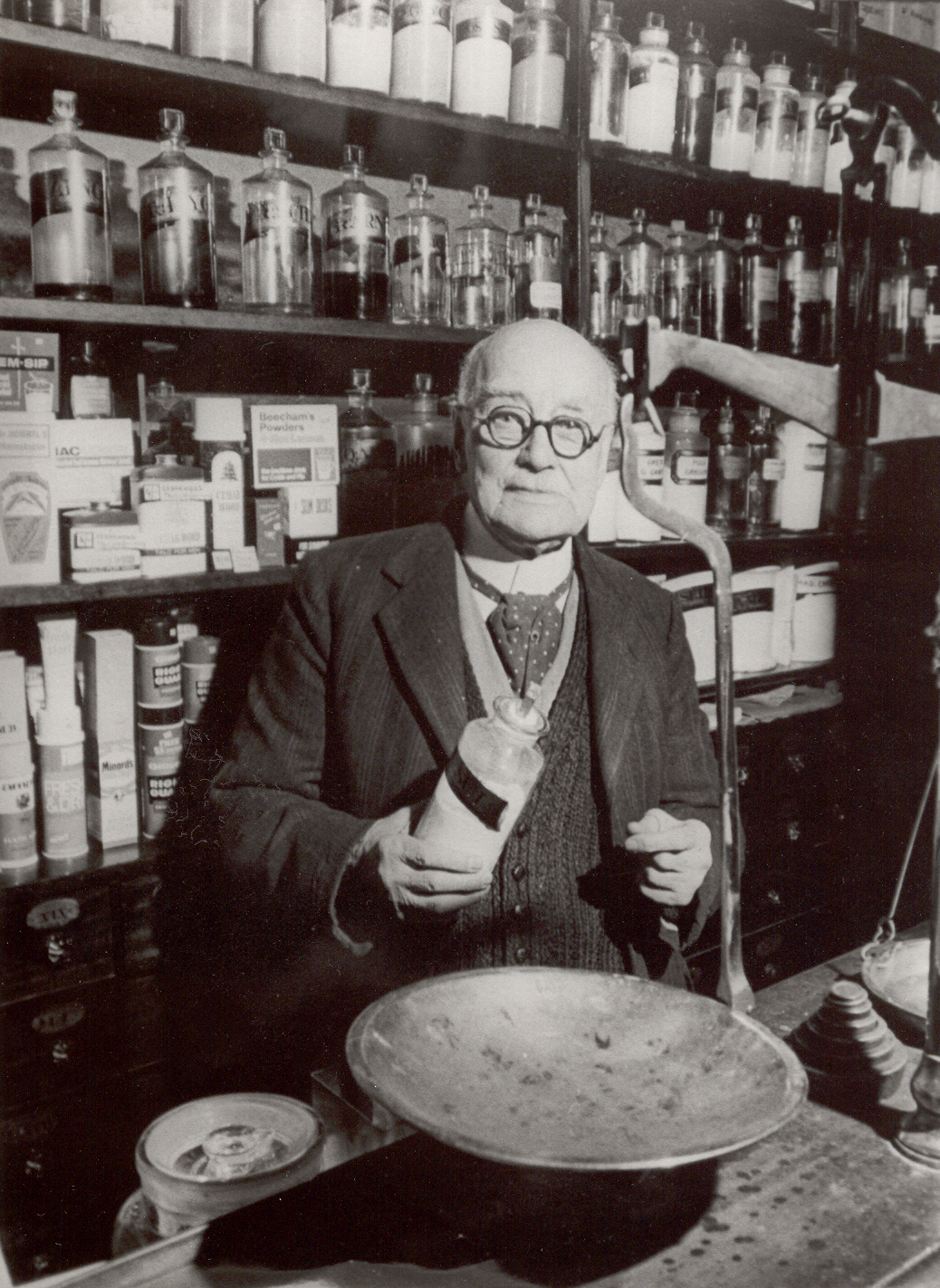 Black and white photograph of Mr Walter Thomas Castelow standing behind a pharmacy counter holding a shop round behind scales on the shop counter. Behind the subject are shelves full of shop rounds and pharmaceutical products. At the time of the photograph Mr Castelow was the oldest pharmacist in Great Britain. He qualified in 1897 and died in 1974 aged 98 years.
